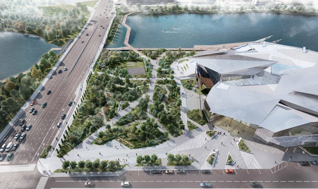 Перед театром появится небольшая площадь треугольной формы, на берегу озера Кабан раскинется сад, а у набережной откроются «зрительные» зоны в окружении «театрального леса».