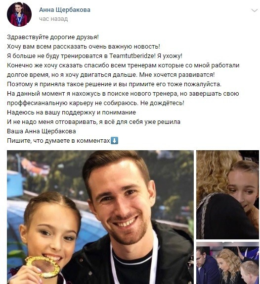 Ранее на ее странице в ВК появилась информация об уходе фигуристки от тренера