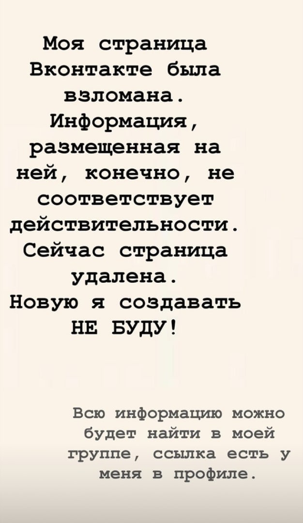 - Моя страница ВКонтакте была взломана. Информация, размещенная на ней, конечно, не соответствует действительности. Сейчас страница удалена, новую создавать не буду, - написала Щербакова в своем Instagram.