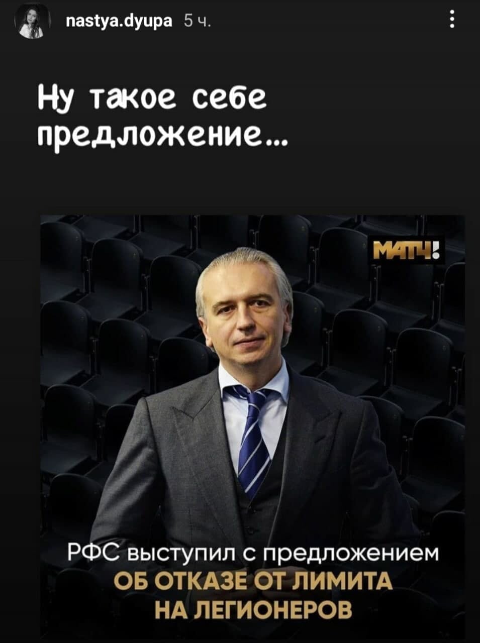 Анастасия, жена вратаря «Рубина» Юрия Дюпина, высказалась против предложения РФС отменить лимит на легионеров в РПЛ.
