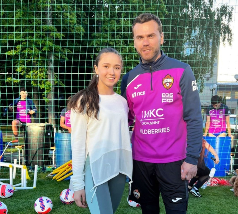 После тренировки Валиева сфотографировалась с лучшим российским вратарем Игорем Акинфеевым.