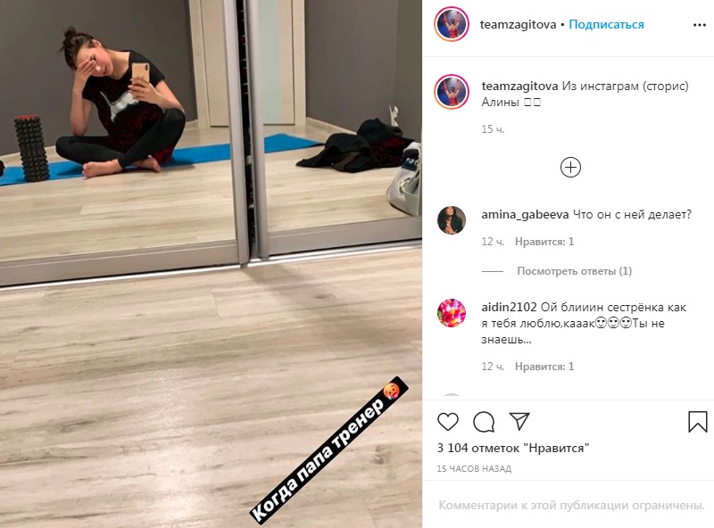 «Когда папа — тренер», — подписала Загитова фотографию, на которой фигуристка делает перерыв в тренировке.
