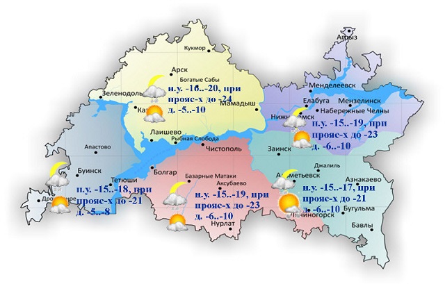 Синоптики прогнозируют, что в ночь на вторник в РТ температура воздуха понизится до -8…-13 градусов, на востоке республики может похолодать до -20 градусов, с повышением к утру до -3…-8 градусов, на востоке до -15 градусов. В дневные часы ожидается от -4 до +1 градуса.