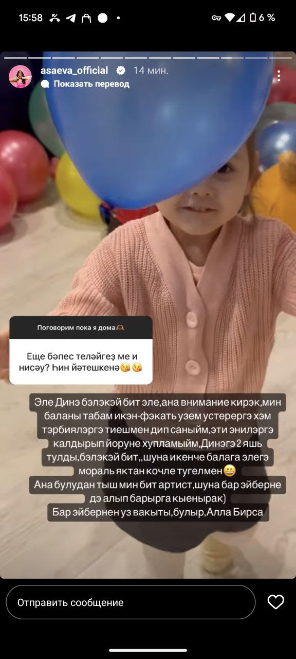 "Динә бәләкәй бит әле, аңа игътибар кирәк. Мин бала табам икән, аны фәкать үзем үстерергә һәм тәрбияләргә тиешмен дип саныйм. Әти-әниләргә калдырып йөрүне хупламыйм. Динәгә ике яшь тулды, әле бәләкәй. Икенче бала алып кайтырга мораль яктан көчле түгелмен. Ана булудан кала, мин бит артист та, шуңа бөтен әйберне алып барырга кыенрак. Бар әйбернең үз вакыты, булыр, Алла Бирса", - дип язган Гөлназ.