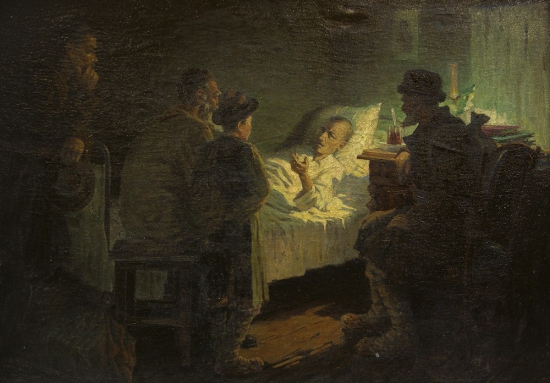 Жаль, что на выставке не оказалось картины, которая принесла первое признание Халилуллову. Речь о небольшом полотне: «Крестьяне у больного Тукая». Полутемная бедно обставленная комнатушка, на кровати смертельно больной поэт, рядом с ним несколько крестьян. По воспоминаниям современников к Габдулле Тукаю за несколько дней до кончины в номер гостиницы “Булгар” пришли земляки и о чем-то с ним долго разговаривали.