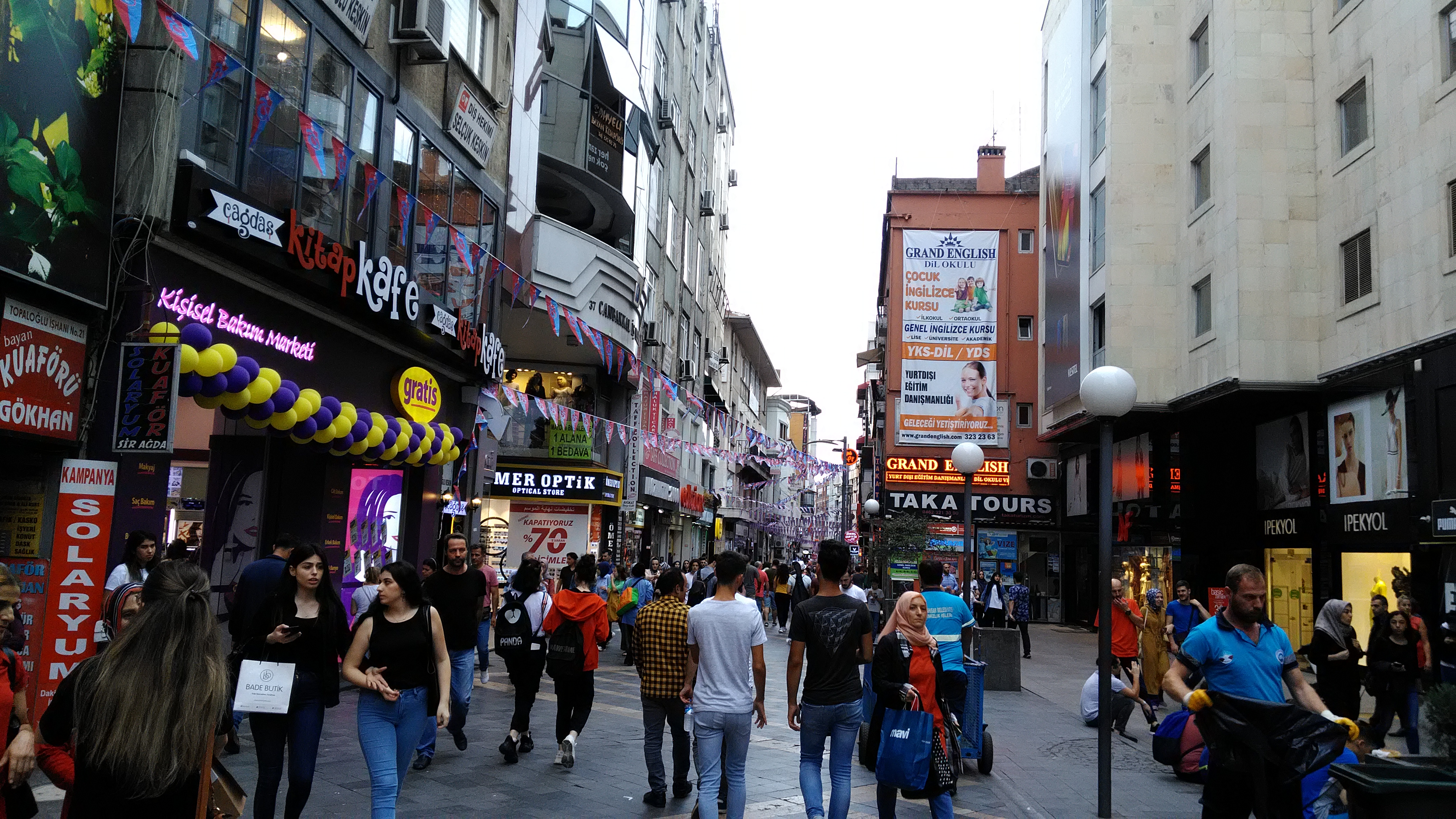 Внешне «Узун сокак» не сильно отличается от других подобных улиц в турецких городах. Многочисленные лавки, магазинчики, отделения банков, кафе и т.д. Наш приезд совпал с началом учебного года в вузах, поэтому на улице было достаточно людно.