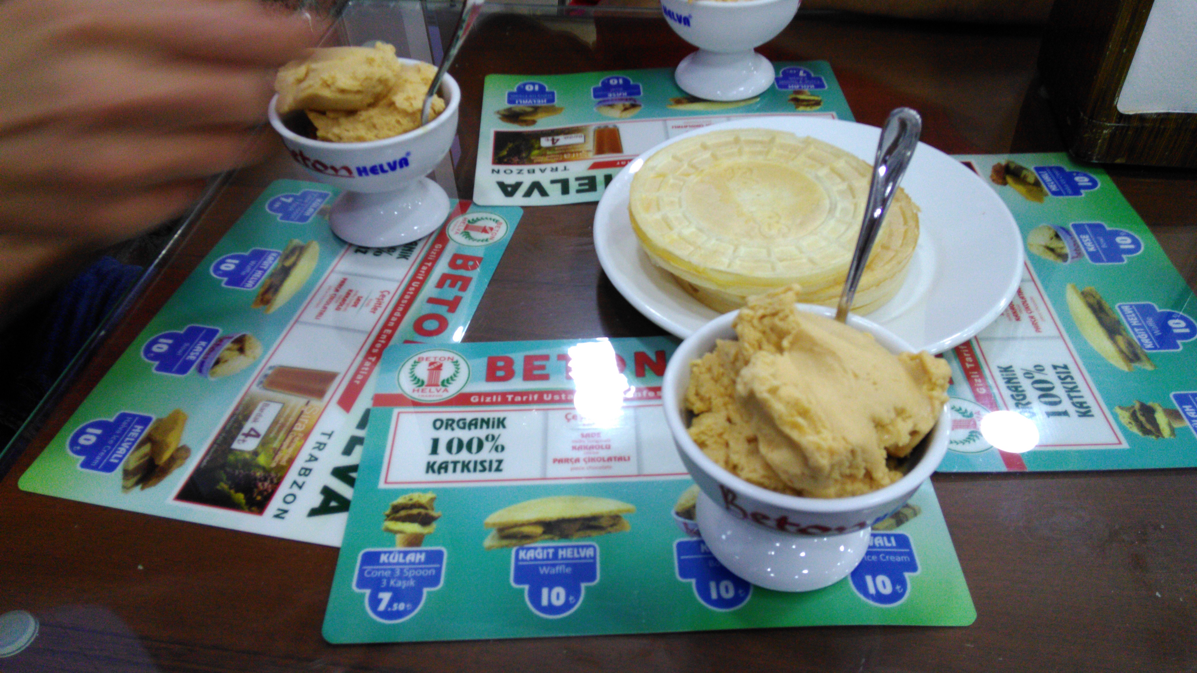 Удалось нам найти и местную сладкую знаменитость – это местное мороженное. Как объяснил гид, это мороженное готовится из молока коров особой породы, при приготовлении они приобретают темный оттенок, и его вкус немного напоминает вкус варенной сгущенки. Его подают шариками, в прикуску дают вафельные кружки со слоями халвы. Самое знаменитое место, где подают это мороженное, это кафе с забавным названием «Бетон Халва» в районе улицы «Узун Сокак».