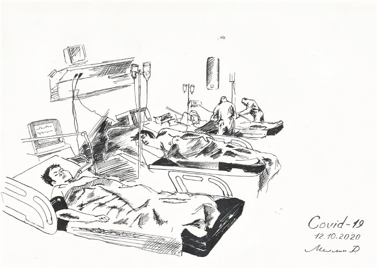 А во втором заходе – это, конечно же смерти, они выбивают землю из под ног. Койка только освобождается и тут же новый пациент. Большое количество больных, были тяжелыми – за всем этим очень сложно было наблюдать. Я своего пациента передавал в реанимацию, и пришлось его сопровождать. Есть выражение «бал у сатаны», а реанимация, наверное – это «утро после гулянки на бале у сатаны». Очень эмоционально сложно видеть, насколько тяжелые люди там лежат. Когда я увидел эту нагрузку на врачей и медперсонал в реанимации, у меня появилась серия задумок, чтобы изобразить именно ситуацию в реанимациях. Потому что о них обычно никто не знает, а они сражаются на самой передовой!