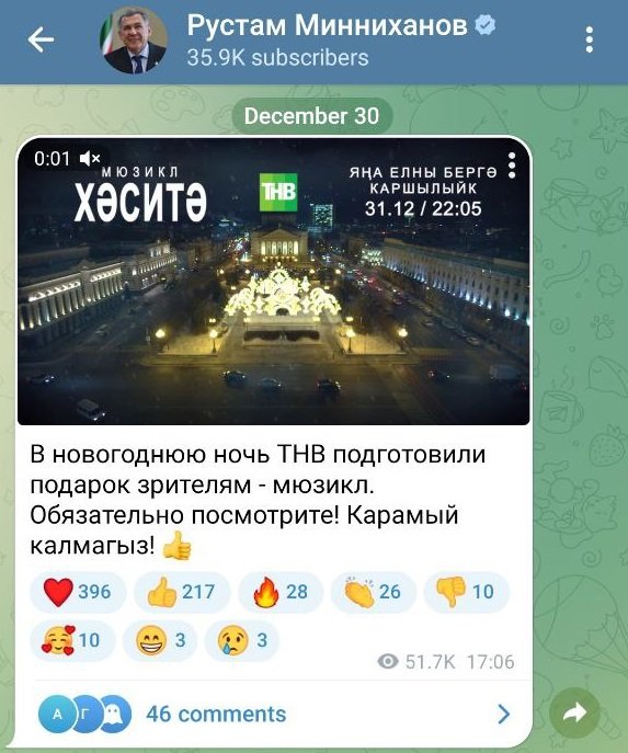 Как известно, декабрьские рейтинги во многом формируются за счет новогодней ночи. И по этому показателю ТНВ уверенно положил на лопатки всех конкурентов. Мюзикл «Хаситэ», созданный специально для новогодней ночи, стал в Татарстане самым просматриваемым шоу 31 декабря. Доля его телесмотрения достигла 19,9%, охват — 20%.