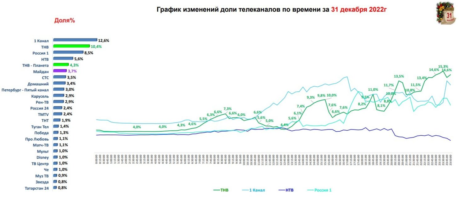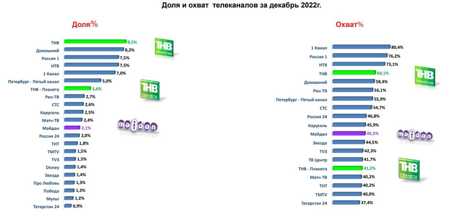 В декабре ТНВ был безоговорочным лидером по доле телесмотрения в Татарстане — она составила 8,5%. На втором месте — телеканал «Домашний», доля которого составила 8,2%. «Россия 1» и НТВ (по 7,5%) делят третье и четвертое места. Первый канал — только на пятой позиции, его доля составила лишь 7%. Напомним, в декабре 2021 года Первый разделил лидерство с ТНВ, набрав по 8,3%, следом шли НТВ и «Домашний». В 2022 ТНВ продолжил уверенный путь наверх. Стабильно себя чувствует и «ТНВ-Планета», которая располагается на 7-м месте с долей телесмотрения в 3,6%.