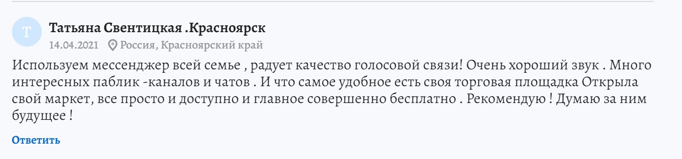 Используем мессенджер всей семье, радует качество голосовой связи! Очень хороший звук. Много интересных паблик -каналов и чатов. И что самое удобное есть своя торговая площадка Открыла свой маркет, все просто и доступно и главное совершенно бесплатно. Рекомендую ! Думаю за ним будущее !