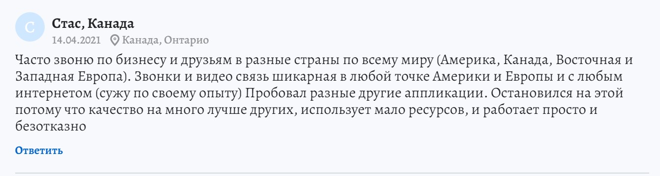 Часто звоню по бизнесу и друзьям в разные страны по всему миру (Америка, Канада, Восточная и Западная Европа). Звонки и видео связь шикарная в любой точке Америки и Европы и с любым интернетом (сужу по своему опыту) Пробовал разные другие аппликации. Остановился на этой потому что качество на много лучше других, использует мало ресурсов, и работает просто и безотказно