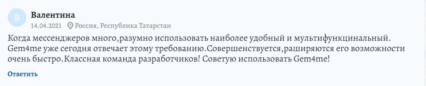 Команда мессенджера изучает отзывы клиентов и на основе полученной информации дорабатывает сервис. Также регулярно внедряются интересные фишки, про которые разработчики Gem4me рассказывают в новостях о компании.