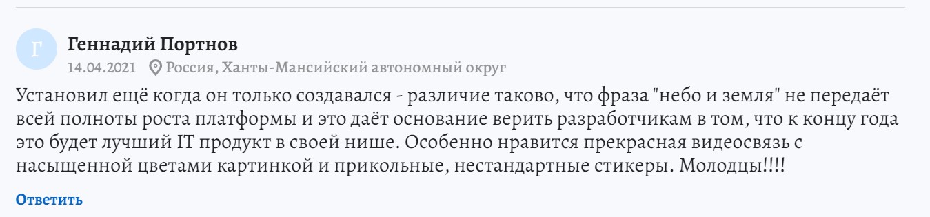 Установил ещё когда он только создавался — различие таково, что фраза «небо и земля» не передаёт всей полноты роста платформы и это даёт основание верить разработчикам в том, что к концу года это будет лучший IT продукт в своей нише. Особенно нравится прекрасная видеосвязь с насыщенной цветами картинкой и прикольные, нестандартные стикеры. Молодцы!!!