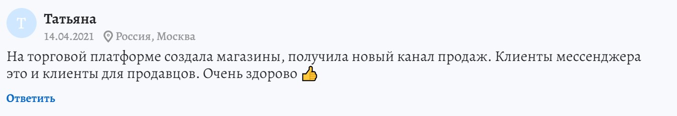 На торговой платформе создала магазины, получила новый канал продаж. Клиенты мессенджера это и клиенты для продавцов. Очень здорово