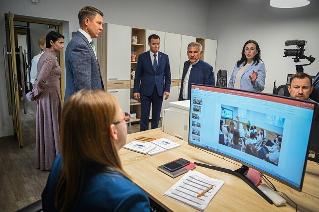 Татарстанский лидер ознакомился с направлениями работы Центра, осмотрел зону приема клиентов, информационный отдел, зал для групповой работы.