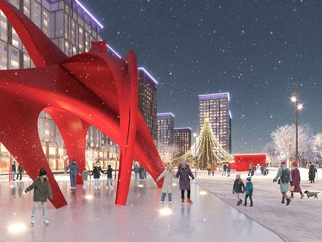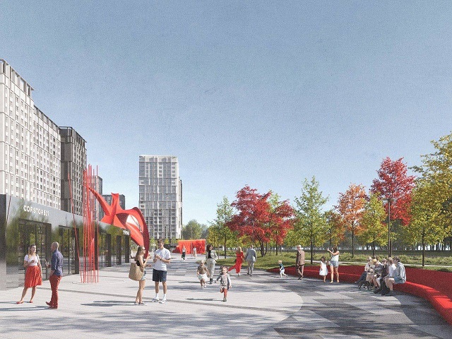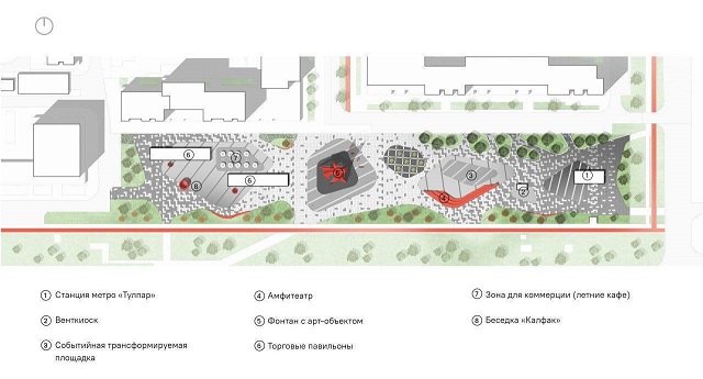 Согласно рендерам, площадь будет разделена на несколько зон — променады и озеленение, спокойные зоны и событийная площадка с амфитеатром, вдохновленных традиционным татарским женским костюмом.