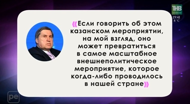 «Выскажу еще одно важное мнение. На мой взгляд, для многих лидеров иностранных государств при сегодняшней внешнеполитической ситуации приехать именно в Казань, скажу мягко, географически и политически гораздо удобнее ,чем даже в Москву или Санкт-Петербург. Это очень тонкий момент, но очень важный», — добавил гендиректор ТНВ.