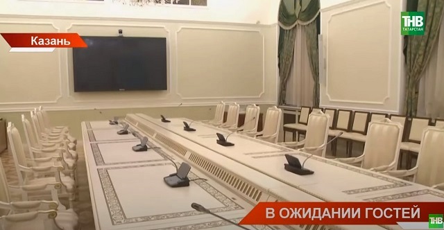 В залах для переговоров уже установили мебель и настроили микрофоны. Во всей красе зарубежные гости увидят и исторические памятники на территории Кремля. Летом укрепили башню Сююмбике, благоустроили стены крепости.