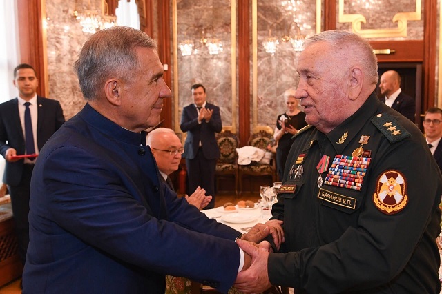 В рамках мероприятия Рустам Минниханов вручил медали в честь 100-летия ТАССР руководителю ансамбля Виктору Елисееву и генеральному инспектору Минобороны РФ, вице-президенту Академии военных наук Валерию Баранову.