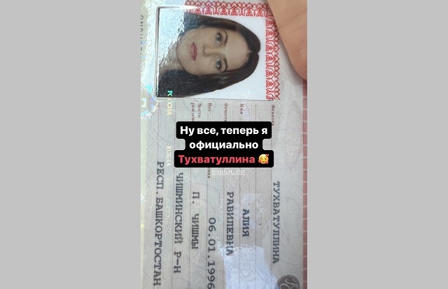Алия получила новый документ в паспортном столе и опубликовала соответствующую фотографию. «Ну все, теперь я официально Тухватуллина», — гордо сообщила артистка.
