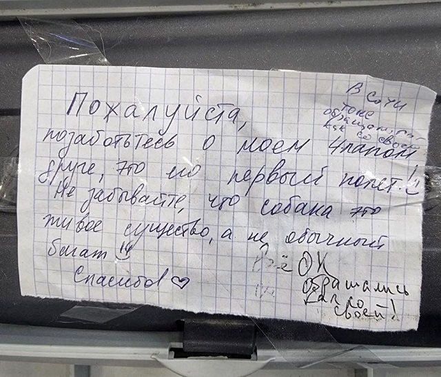 Перед вылетом из Казани в Сочи хозяйка прикрепила к переноске небольшую записку: «Пожалуйста, позаботьтесь о моем друге, это его первый полет. Не забывайте, что собака живое существо, а не обычный багаж. Спасибо».