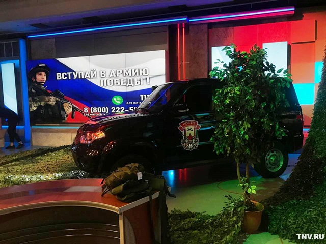 В эти минуты в студии ТНВ полным ходом идет подготовка к 12-часовому телемарафону «Вступай в армию Победы!», который пройдет 15 июля с 08:00 до 20:00. Оформление студии происходит в патриотической стилистике.