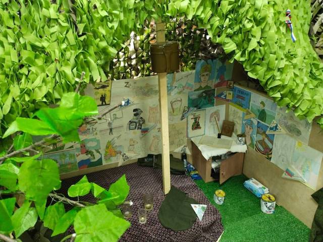 Центральный экспонат — инсталляция блиндажа, сделанная школьниками, с детскими рисунками, письмами и фотографиями участников спецоперации.