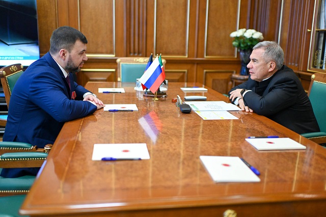 На встрече с Пушилиным в Казанском Кремле Минниханов отметил, что «Татарстан активно сотрудничает с Луганской Народной Республикой в части восстановления города Лисичанска. Будем рады развитию связей и с Донецкой Народной Республикой».