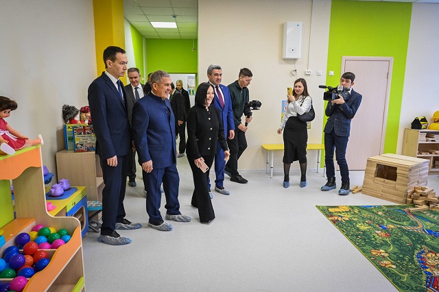 Раис Татарстана Рустам Минниханов принял участие в открытии в Альметьевске построенного по нацпроекту «Демография» детского сада «Алсу», рассчитанного на 110 мест.