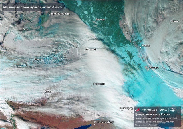 «На спутниковом снимке «Метеора-М» — циклон «Ольга». Он образовался на юге Гренландии и движется в сторону Поволжья. В Москве пик североатлантического циклона ожидается сегодня», — говорится в описании к снимку.