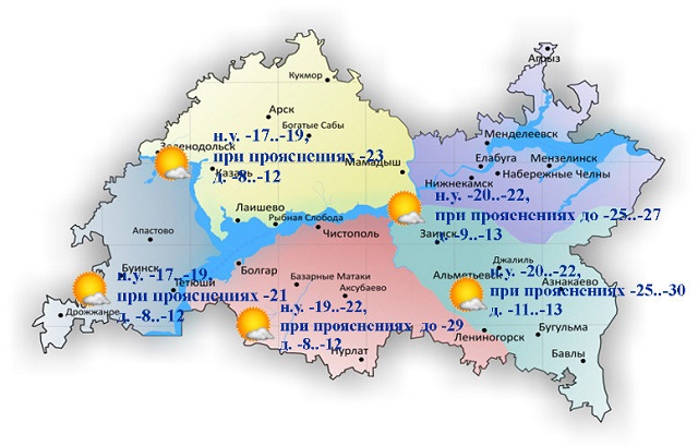 В Казани минимальная температура воздуха предстоящей ночью, а также утром составит -17…-19 градусов, при прояснениях мороз усилится до -23 градусов. В дневные часы в городе столбики термометров покажут от -9 до -11 градусов.