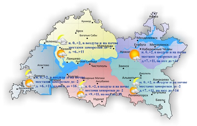 Днем на преобладающей территории Татарстана потеплеет до +13…+18 градусов, на западе будет не выше +6…+11 градусов, теплее всего будет на крайнем юго-востоке. Там воздух прогреется аж до +19…+21 градуса.