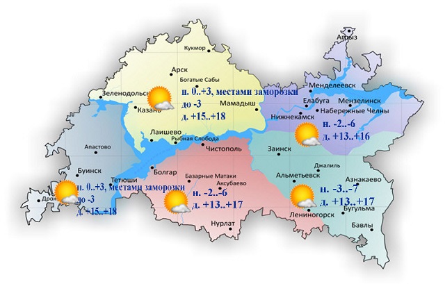 Холоднее всего будет на юге и востоке Татарстана, там ожидаются заморозки в воздухе и на почве до 0…-2 градусов. Максимальная температура воздуха днем в пятницу составит +12…+17 градусов, на востоке РТ разжарит до +20 градусов.