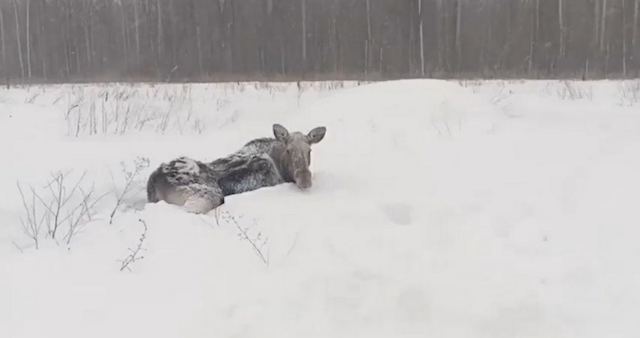 Животное провалилось в глубокий сугроб и не могло выбраться самостоятельно. Спасатели расчистили путь с помощью трактора, после чего лось ушел в лес.
