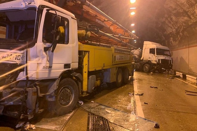 В сети опубликовали жесткие кадры массовой аварии, которая произошла на 34-м километре автодороги «Адлер – Красная Поляна». Судя по кадрам, подземный коридор не поделили три легковушки и два грузовика.