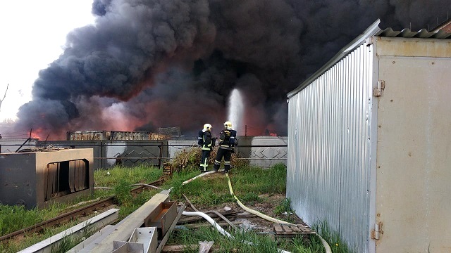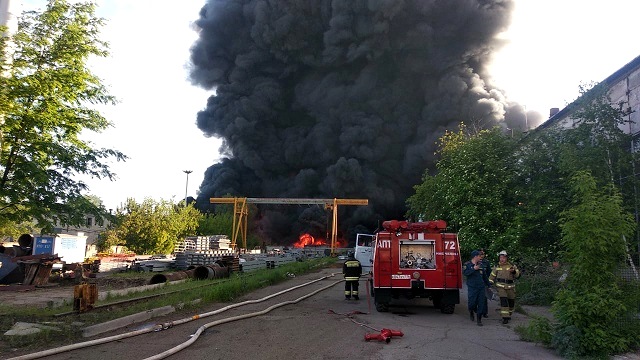 Прибывшие на место пожарные установили, что происходит горение отходов резинотехнических изделий, пластика на открытой площадке с переходом огня на рядом стоящее складское помещение. Площадь пожара составила тысячу квадратных метров.