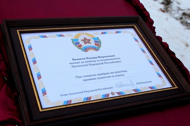 Татарстанец воевал за свободу и независимость Луганской Народной Республики. В благодарственном письме главы ЛНР Леонида Пасечника отмечено, что Ильдар Вазыков пал смертью храбрых на поле боя, проявив мужество и отвагу.