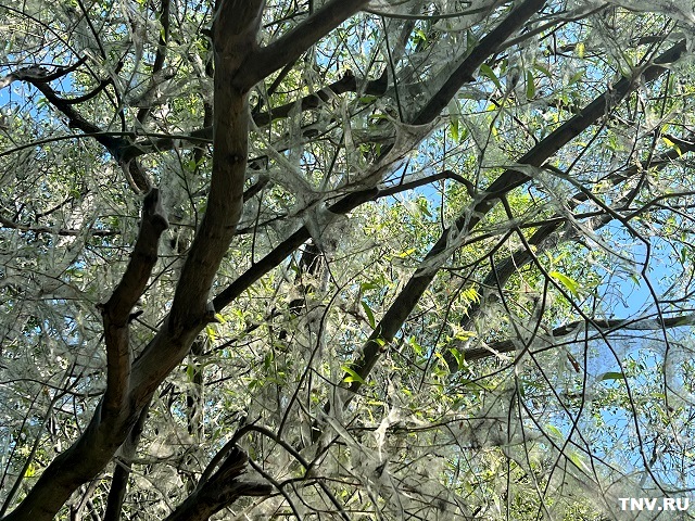 Московский район Казани накрыл настоящий гусеничный апокалипсис. Деревья, облепленные плотной паутиной с насекомыми внутри, замечены на улицах Батыршина, Кулахметова и Серова. Гусеницы беспощадно поражают ивы и осины.