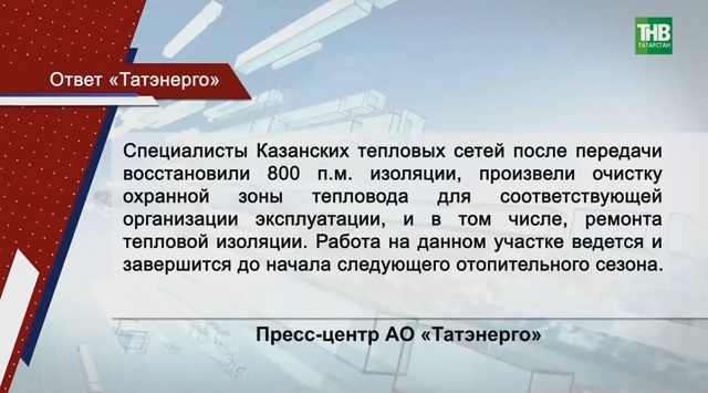 Теплопровод находится на балансе «Татэнерго». Здесь пояснили, изолировать его полностью не успели. Больше полутора километров сетей им передали только в августе прошлого года, перед началом отопительного сезона.