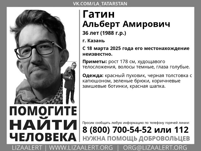 В Казани найден мертвым 36-летний дизайнер Альберт Гатин, который 18 марта вышел с работы на улице Мазита Гафури и пропал, сообщили волонтеры поискового отряда «Лиза Алерт».