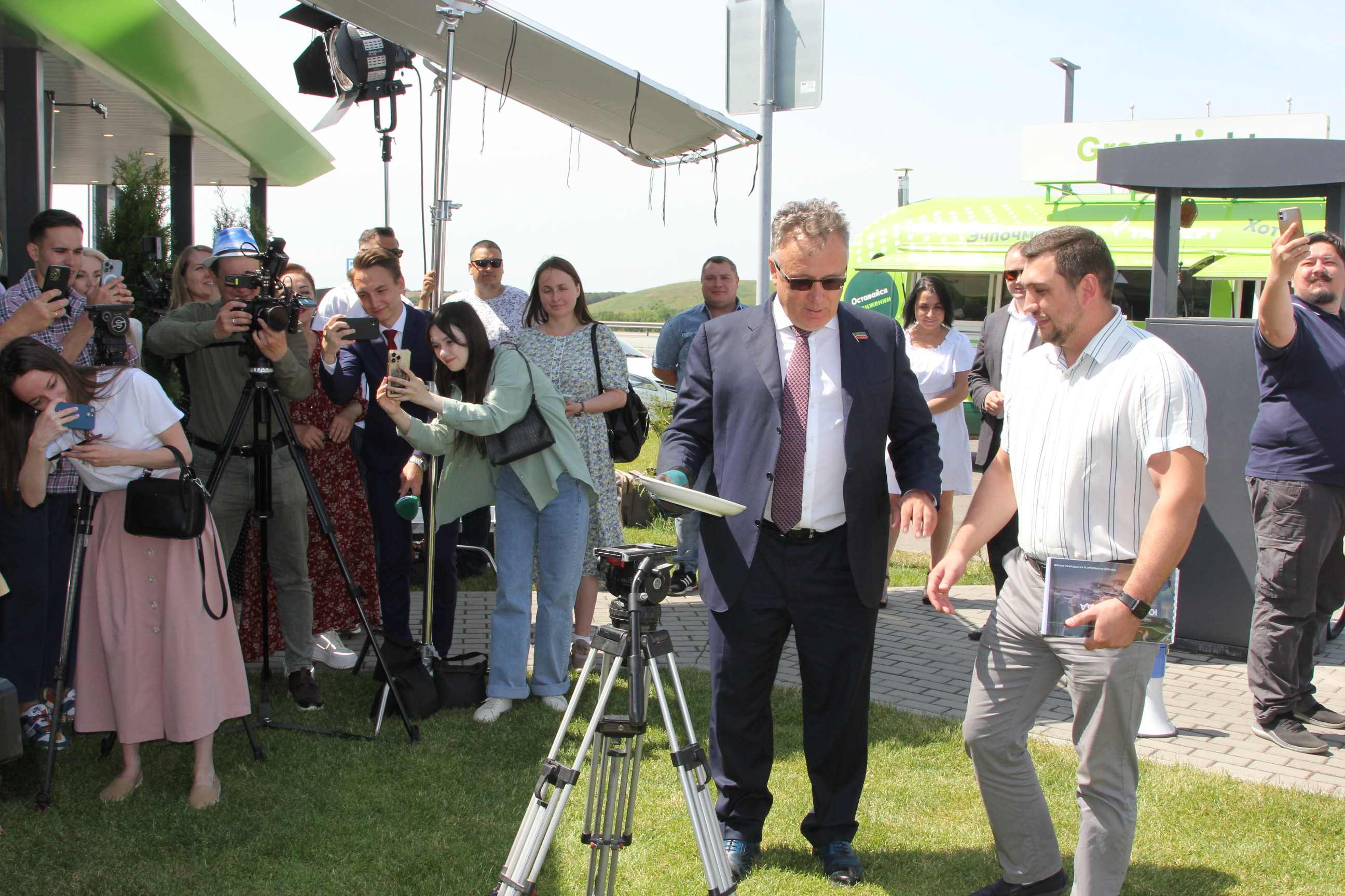 Иң беренче эш булып кунакларга һәм журналистларга сериалны төшерү урыны күрсәтелде. Ул “Татнефть” ягулык станциясе. Биредә күтәренке кәеф, бер-береңә ышаныч һәм көчле продукт эшләү теләге хөкем сөрә. Яңа сериал карап утырачак көзге салкынча кичләр әле алда, ә артистлар бүген үк эшкә кереште – безгә өзекне уйнап та күрсәттеләр. Илшат Әминев билгеләп үткәнчә, алга таба да болай уйнасак, тамашачыбызга, һичшиксез, ошаячак. Станциядə хəрбилəрчə тəртип урнаштырган директор Рим Кимович (Татарстанның халык артисты Искәндәр Хәйруллин) бар шәкертләрен тездереп бастырды да, эш барышын тикшерә башлады. Эпизодтан сериалның юмор хисенә бай булуын, шул ук вакытта җитдилек, эшкә төпле караш булуын да сизә алдык.